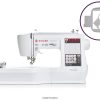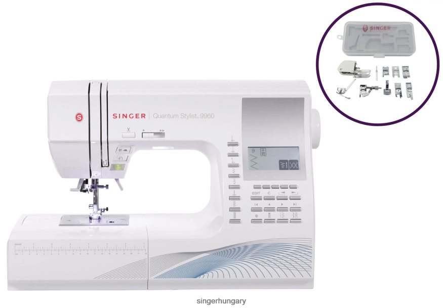 a nyomótalp készlet még szélesebb körű varrási feladatok elvégzését teszi lehetővé, a mellékelt simító/szabadkézi hímzőtalppal, vakszegélyes lábbal, zsinórtalppal , egyenletes adagolású/sétáló láb, gyűjtőtalp, keskenyen hengerelt szegőtalp, túlhúzó láb, speciális célú láb, egyenes öltésű láb és ikertű – mindez tartós, testre szabott énekes műanyag tartályban, amely párnázott kivehető elemet is tartalmaz beilleszteni.